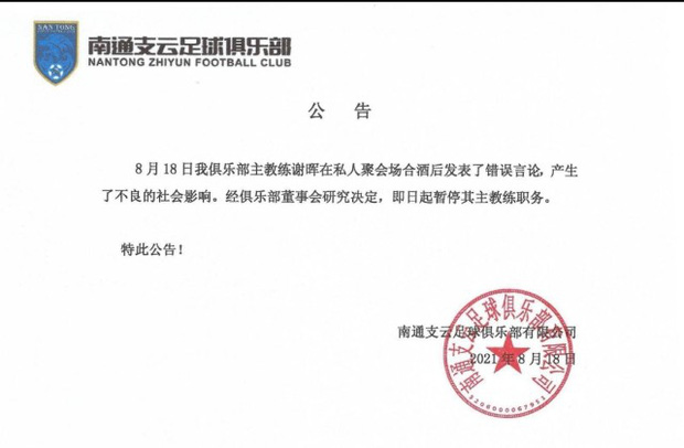 Ngay sau khi video quay lén được tung ra, ngay lập tức CLB Nantong Zhiyun - đội bóng thuộc hạng Nhất Trung Quốc mà Tạ Huy đang là HLV, đã ra thông báo đình chỉ công tác của anh.