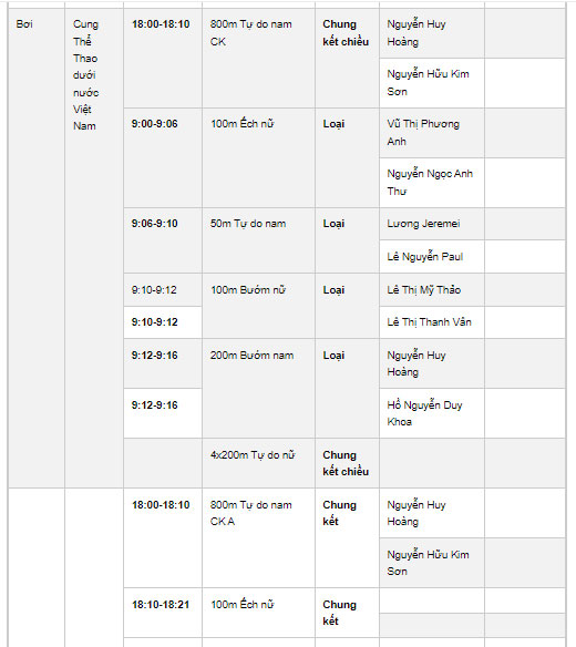 Trong khi đó ở môn bơi, Việt Nam cũng có hy vọng giành thêm HCV ở các nội dung của nam như 800m tự do, 50m tự do, 200m bướm... Đây là kỳ SEA Games thành công của đội tuyển bơi Việt Nam dù không còn kình ngư chủ lực Nguyễn Thị Ánh Viên. Thành tích đáng chú ý nhất của đội tuyển bơi Việt Nam là tấm HCV và phá kỷ lục ở nội dung 4x200m tự do nam.