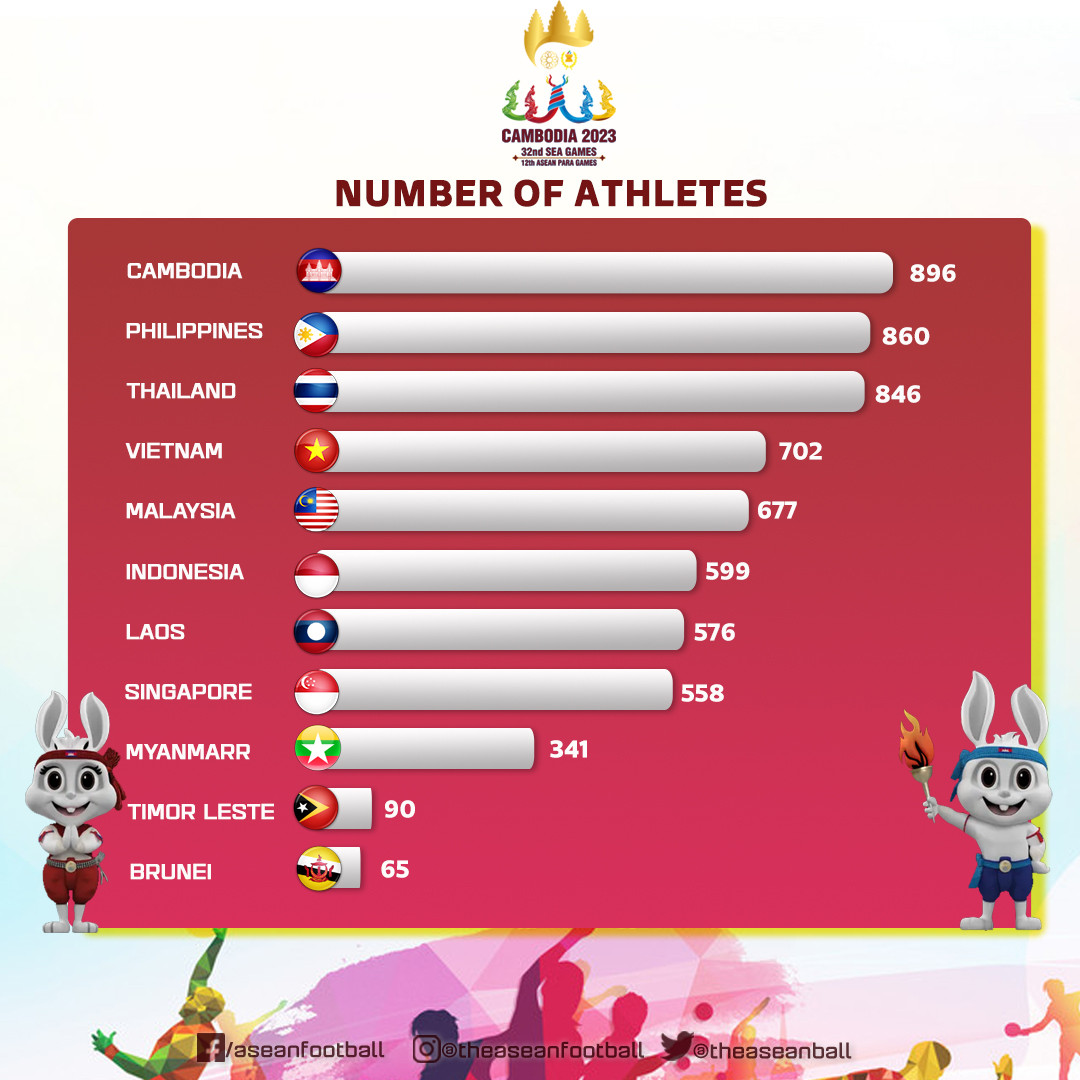 Tiếp theo là đoàn Lào với 576 VĐV, Malaysia với tổng cộng 677 VĐV tranh tài trên đất Campuchia. Tiếp sau là đoàn Myanmar đại diện cho 341 VĐV.