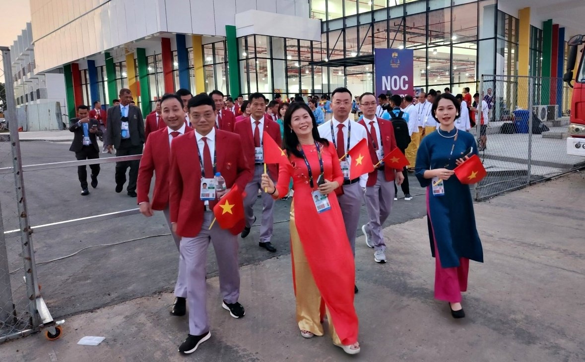 Tiến ra sân khấu là đoàn thể thao Việt Nam với tổng số 702 VĐV, nhiều thứ 4. Người cầm cờ là kình ngư Nguyễn Huy Hoàng. Đoàn TTVN đến với SEA Games 32 với mục tiêu giành được từ 90 đến 120 HCV, đứng nhóm đầu trên bảng tổng sắp huy chương.