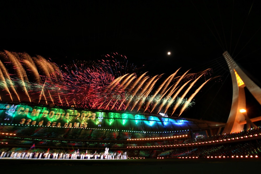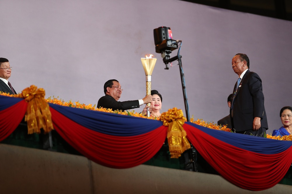 Thủ tướng Vương quốc Campuchia Hun Sen tuyên bố SEA Games 32 chính thức được bắt đầu, cùng với đó là loạt pháo hoa được bắn lên bầu trời SVĐ Morodok Techo.