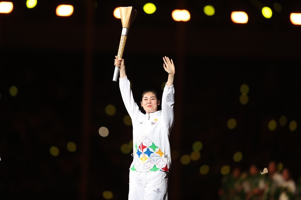 Những VĐV nổi tiếng nhất của thể thao Campuchia cùng nhau thực hiện màn rước và châm đuốc thiêng.