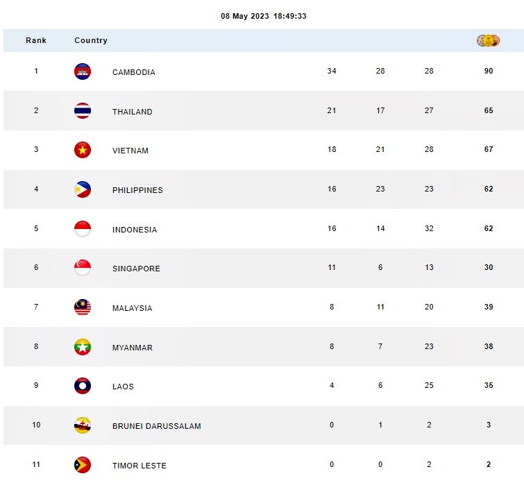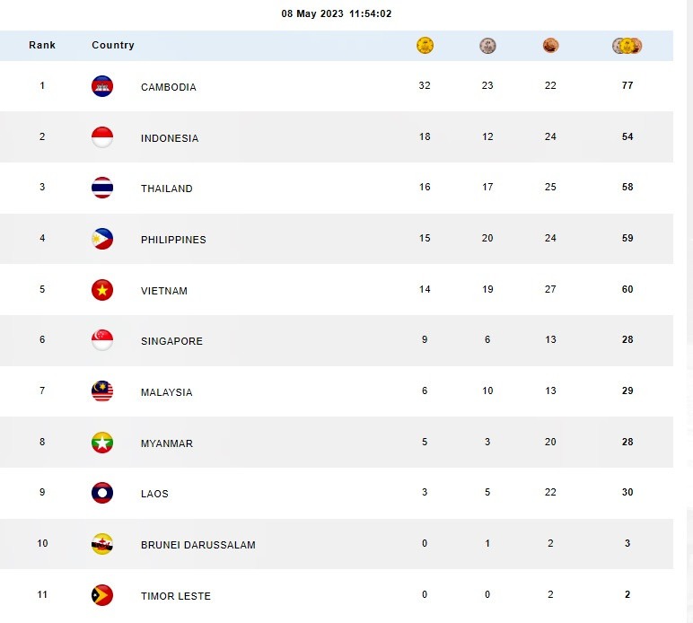 Bảng tổng sắp huy chương SEA Games 32 hôm nay 8/5 (cập nhật)