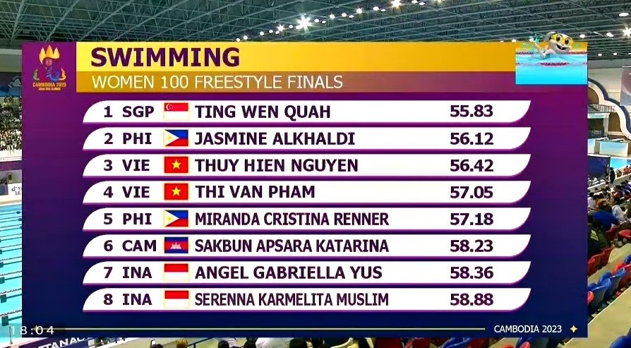 Kình ngư 14 tuổi của Việt Nam Nguyễn Thúy Hiền xuất sắc cán đích thứ 3 nội dung 100m tự do nữ, với thành tích 56 giây 42 để giành HCĐ, thành tích rất đáng khen đối với thần đồng bơi lội của Việt Nam. Phạm Thị Vân đứng thứ 4 khi đạt thời gian 57 giây 05.