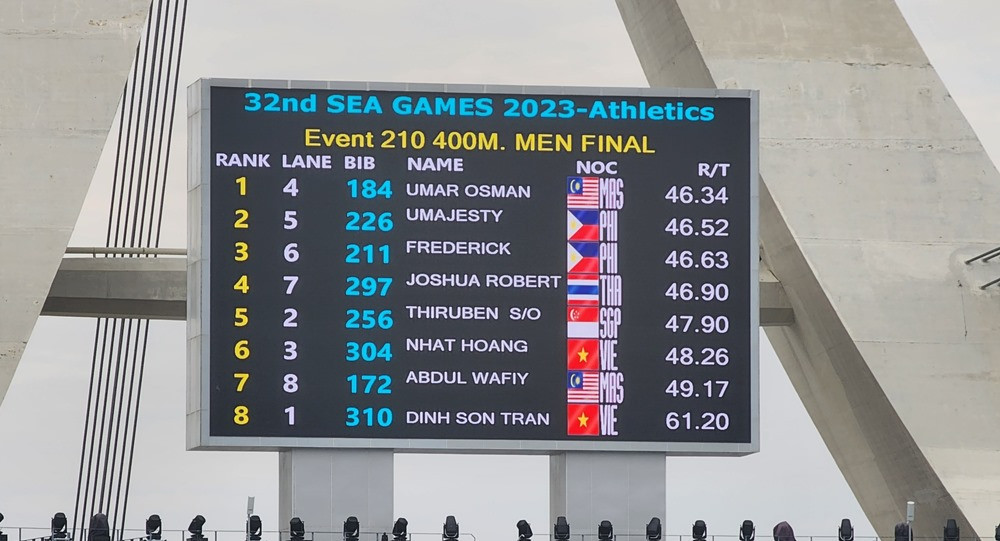 Trần Nhật Hoàng về đích thứ 6, trong khi Trần Đình Sơn về thứ 8 ở chung kết 400m nam.