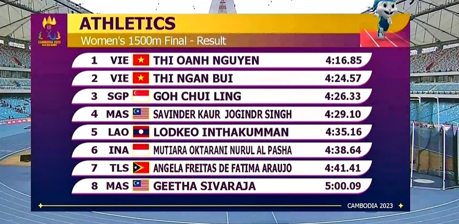 Nguyễn Thị Oanh tỏ ra vô đối trên đường chạy 1.500m nữ, chân chạy của Việt Nam cán đích đầu tiên với thời gian 4 phút 16 giây 85. Oanh "Ỉn" bảo vệ thành công tấm HCV và chỉ có 10 phút để chuẩn bị cho chung kết nội dung chạy 3.000m vượt chướng ngại vật.