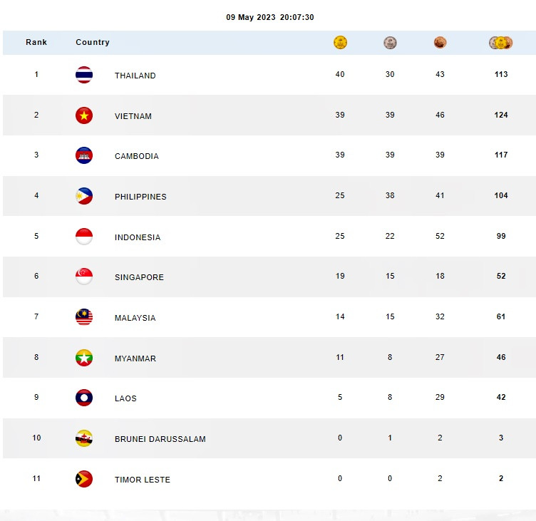 Bảng tổng sắp huy chương SEA Games 32 mới nhất