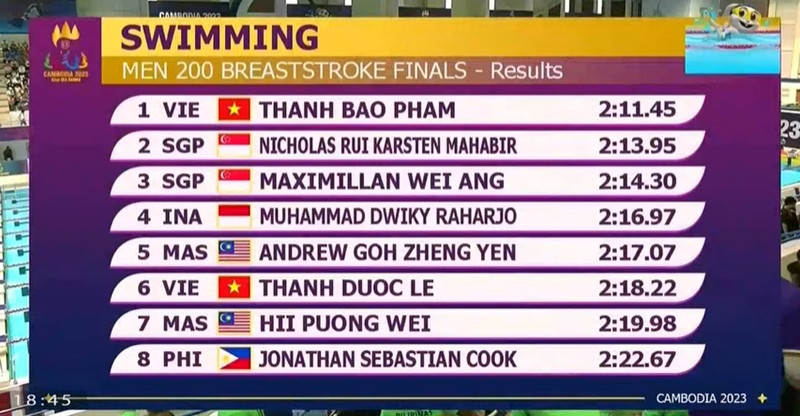 Thanh Bảo về nhất nhóm 1 vòng loại 200m ếch nam với thành tích 2 phút 18 giây 48. Trong khi đó, Thành Được về nhì nhóm hai sau 2 phút 20 giây 26. Cả 2 kình ngư Việt Nam cùng vào tranh tài tại chung kết chiều nay.