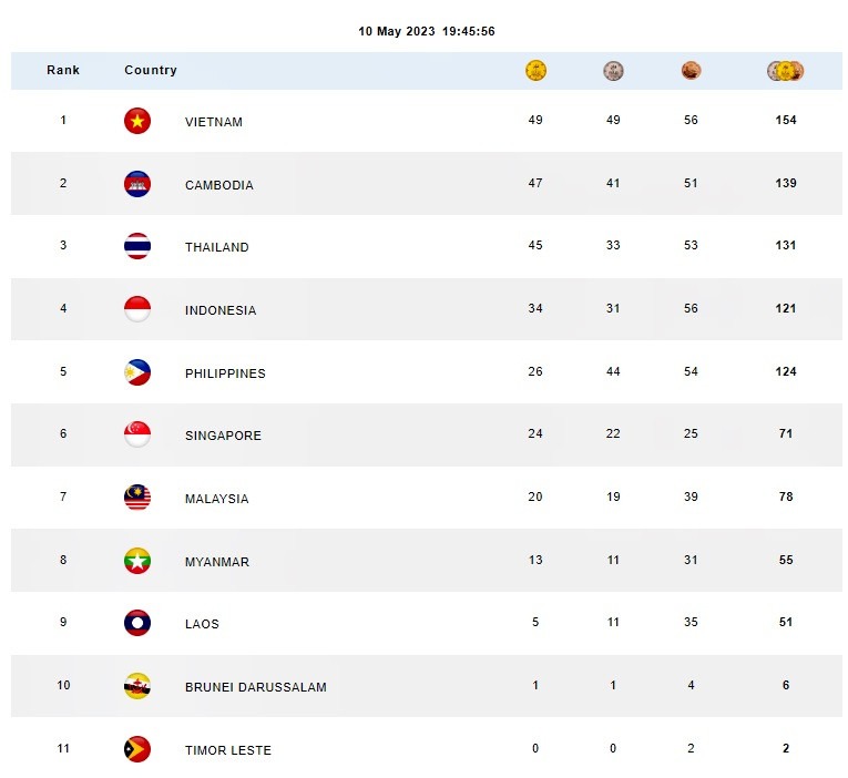 Bảng tổng sắp huy chương SEA Games 32 mới nhất