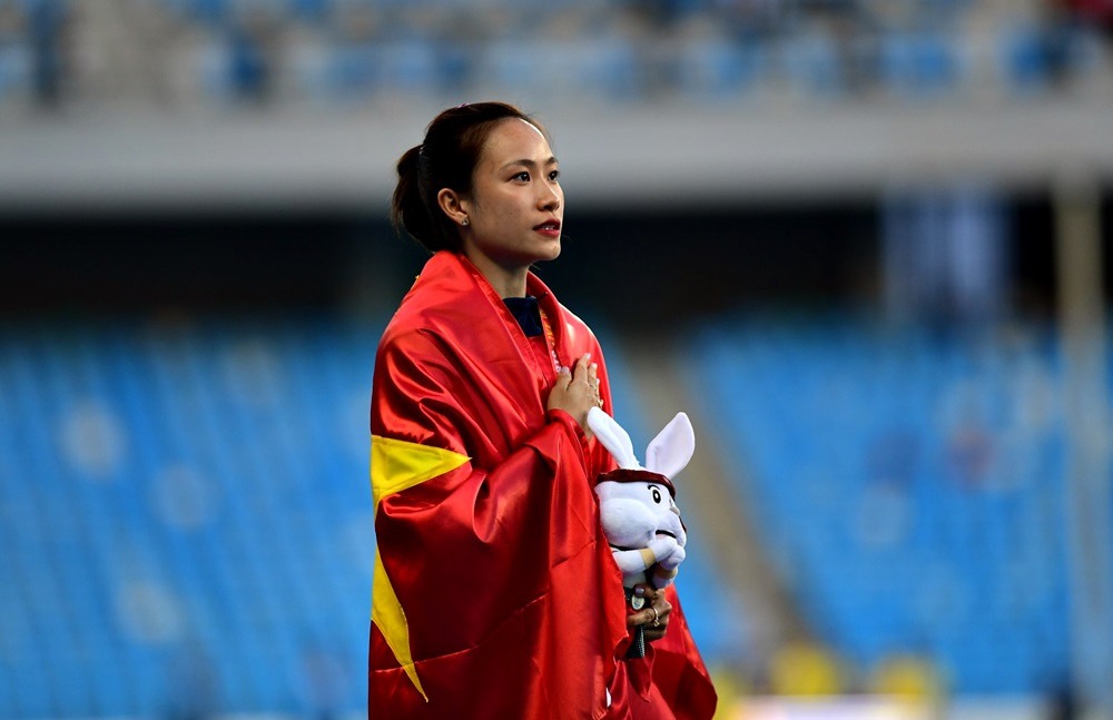 20h16- Huỳnh Thị Mỹ Tiên trên bục nhận HCV trên đường chạy 100m vượt rào