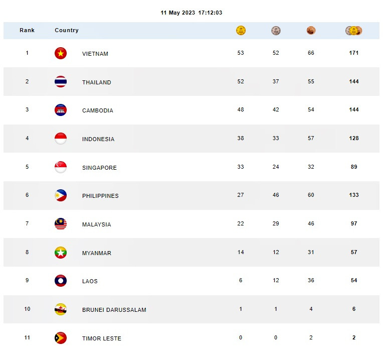 Bảng tổng sắp huy chương SEA Games 32 mới nhất