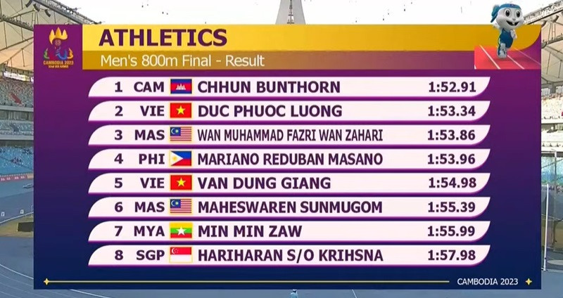 Chân chạy Lương Đức Phước dù rấtcố gắng nhưng không thể vượt qua được chân chạy của nước chủ nhà Campuchia và chấp nhận giành tấm HCB ở nội dung 800m nam.
