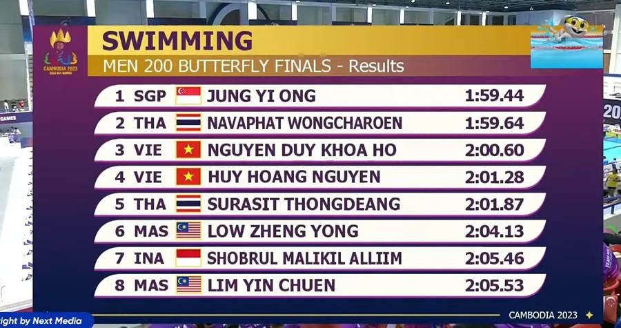 Huy Hoàng do phải thi liên tiếp 2 nội dung chung kết cách nhau hơn 10 phút nên chỉ có được vị trí thứ 4 nội dung 200m bướm nam. Kình ngư Hồ Nguyễn Duy Khoa giành HCĐ với thành tích 2 phút 00 giây 60.
