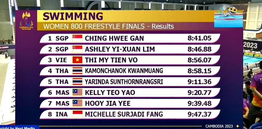 VĐV Võ Thị Mỹ Tiên về đích thứ 3 nội dung bơi 800m tự do nữ và giành HCĐ, với thành tích 8 phút 56 giây 07. HCV và HCB thuộc về 2 kình ngư người Singapore. Người chiến thắng là Gan Ching Hwee với thành tích 8 phút 41 phút 05, cô không thể phá kỷ lục của Nguyễn Thị Ánh Viên.