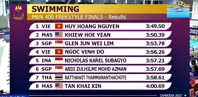 Kình ngư Nguyễn Huy Hoàng xuất sắc cán đích đầu tiên ở nội dung 400m tự do nam, với thành tích 3 phút 49 giây 50. Đây là tấm HCV thứ 3 của Huy Hoàng tại SEA Games 32.