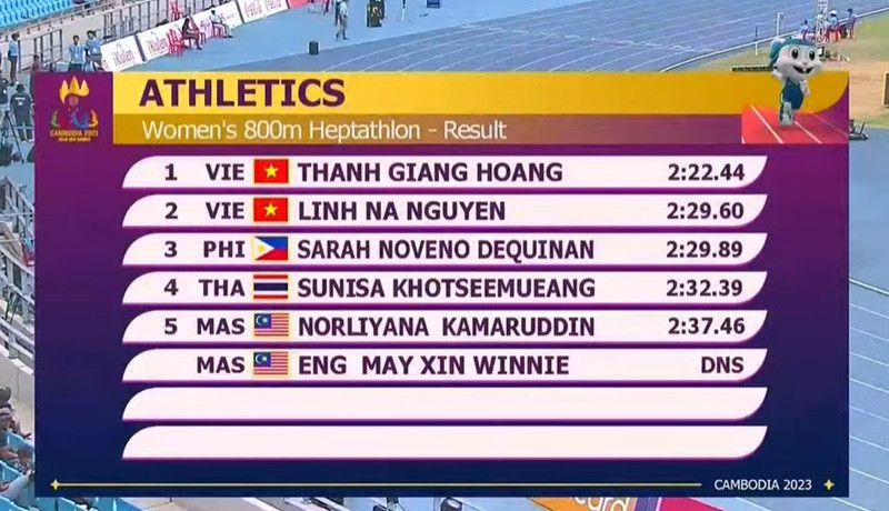 Hai VĐV Nguyễn Linh Na và Hoàng Thanh Giang hoàn thành phần thi cuối cùng - chạy 800m nội dung 7 môn phối hợp. Thanh Giang về nhất, trong khi Linh Na về nhì và xếp nhất chung cuộc, qua đó giành tấm HCV gian khó nhất nhì bộ môn điền kinh. Đây được xem là tấm HC vàng mười trong thể thao.