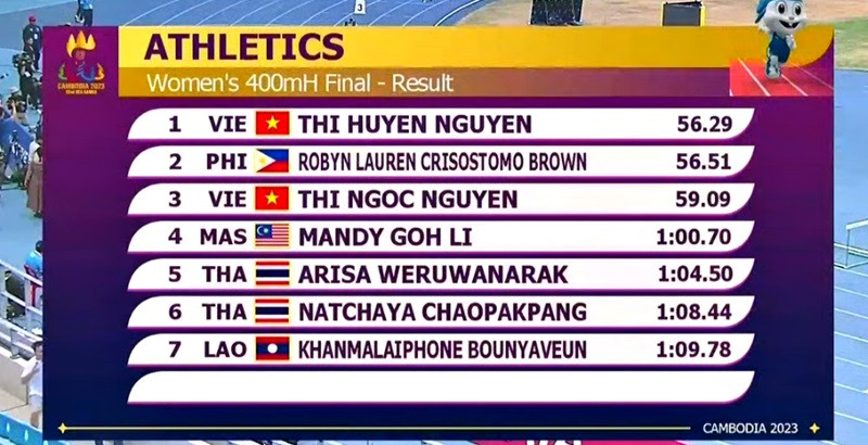 Sau khi chỉ giành HCB 400m, Nguyễn Thị Huyền đã phục hận thành công khi xuất sắc về nhất 400m vượt rào nữ, với thành tích 56 giây 29. HCB thuộc về VĐV Philippines, trong khi HCĐ thuộc về chân chạy khác của Việt Nam là Nguyễn Thị Ngọc, sau 59 giây 09.