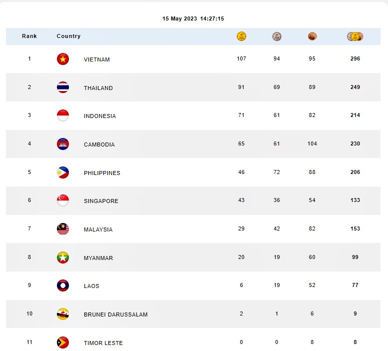 Bảng tổng sắp huy chương SEA Games 32 ngày 15/5
