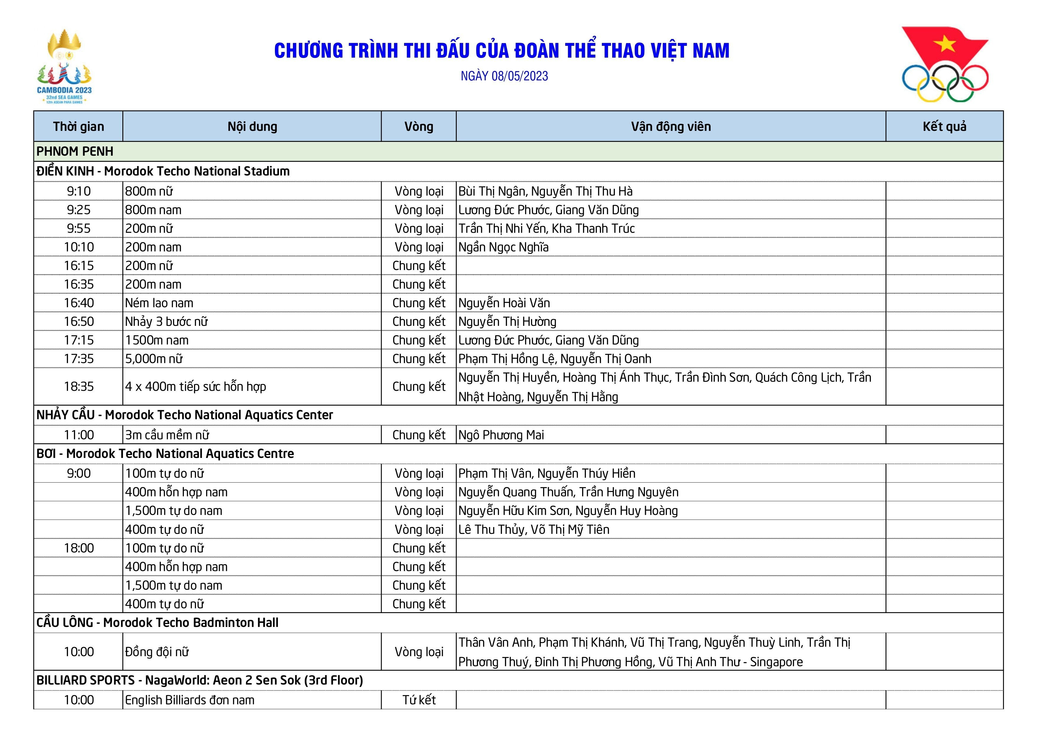 08/05/2023 12:30SEA Games 32 ngày 8/5: Chờ 'mưa vàng' ở điền kinh, bơi lội