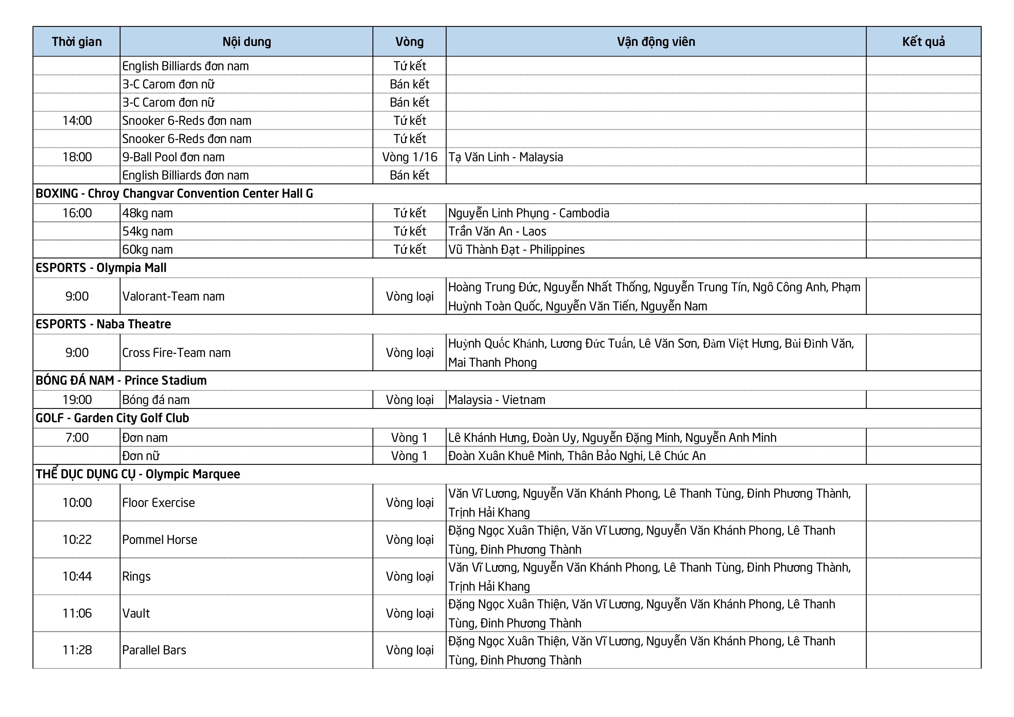 Đặc biệt ở môn bóng đá nam, U22 Việt Nam có trận cầu then chốt gặp U22 Malaysia, vào lúc 19h.