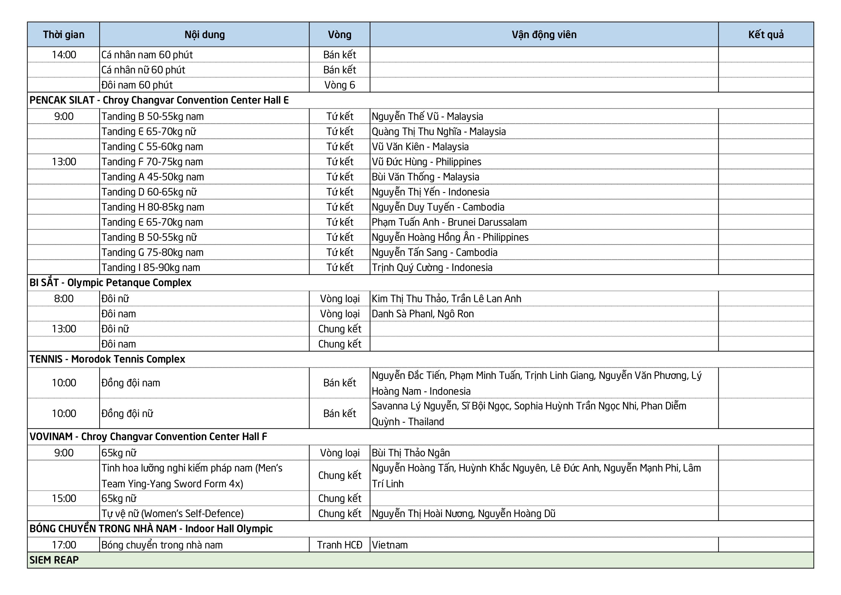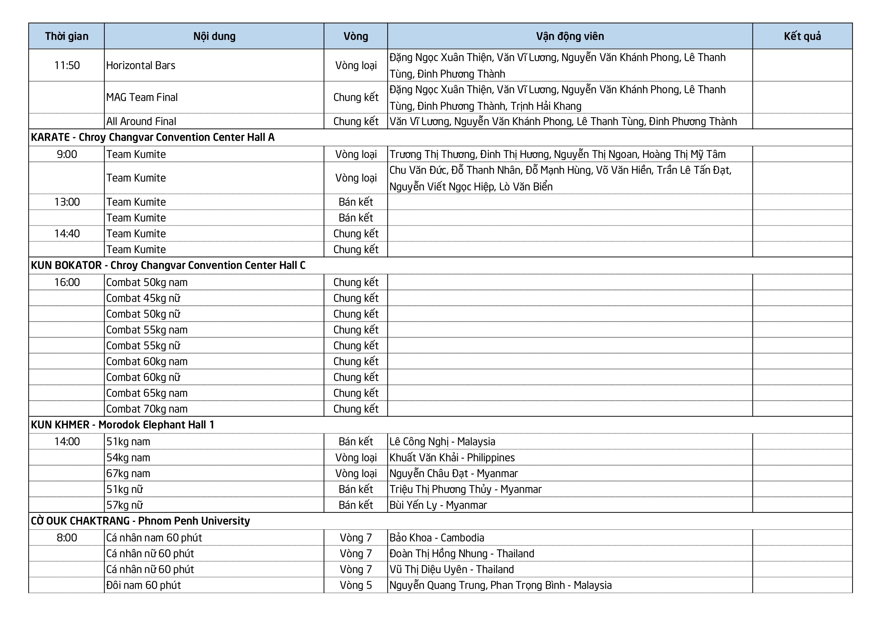 Ngoài điền kinh và bơi, các môn võ cũng hứa hẹn mang về nhiều HCV cho đoàn TTVN, trong đó karate có 2 nội dung chung kết kumite, Kun Bokator có 9 trận chung kết, vovinam có 3 nội dung chung kết...