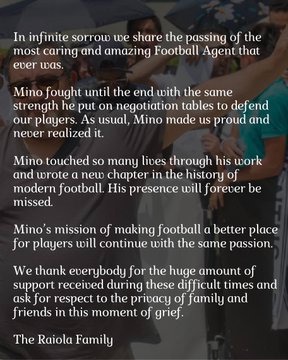 Cụ thể, người nhà của Mino Raiola viết: "Trong niềm tiếc thương vô hạn, chúng tôi xin thông báo về sự ra đi của người đại diện bóng đá được quan tâm và và vô cùng yêu quý trên thế giới. Mino đã chiến đấu đến cùng giống như bao lần đã làm trong các cuộc đàm phán để bảo vệ các cầu thủ của chúng ta suốt thời gian qua. Mino luôn khiến chúng ta tự hào dù anh không bao giờ nhận ra điều đó..."