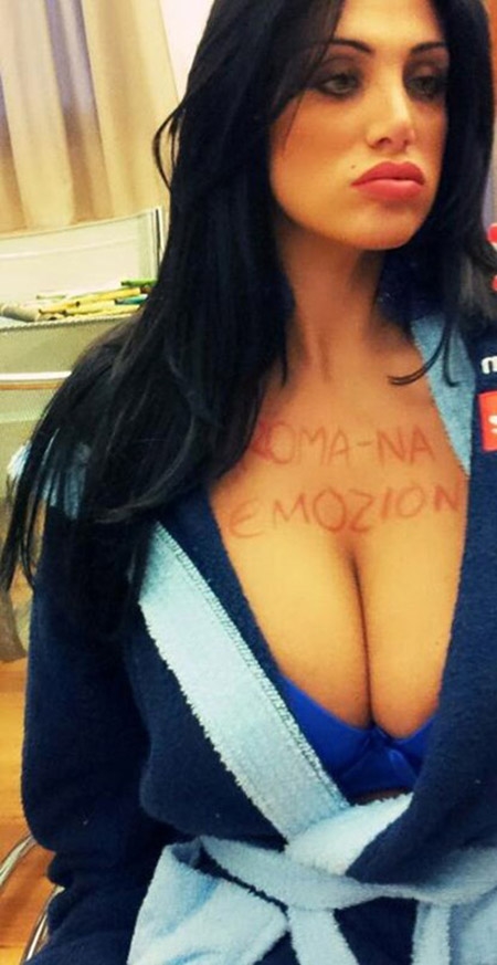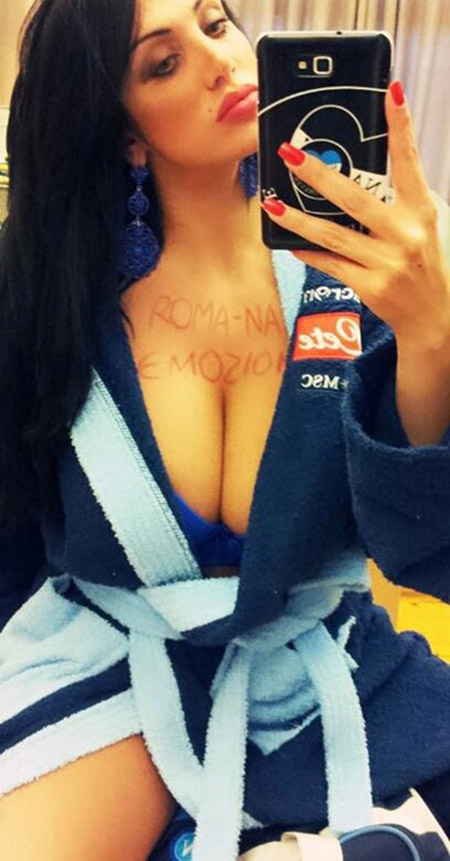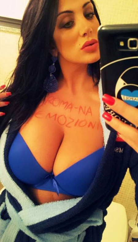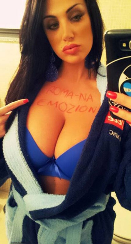 Nhân dịp này, siêu mẫu Claudia Romani quyết định trổ tài dự đoán tỷ số của mình bằng cách tung ra loạt ảnh khoe vòng một “cực khủng” và ghi các dự đoán của mình lên trên đó.