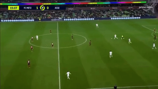 Tiền đạo người Tunisia nhận bóng rồi lập tức di chuyển lên phía trước để bắt đầu pha phản công của St Etienne. Khi rê dắt lên gần vòng tròn giữa sân, Khazri bắt đầu giảm tốc độ để quan sát và phân tích tình huống.