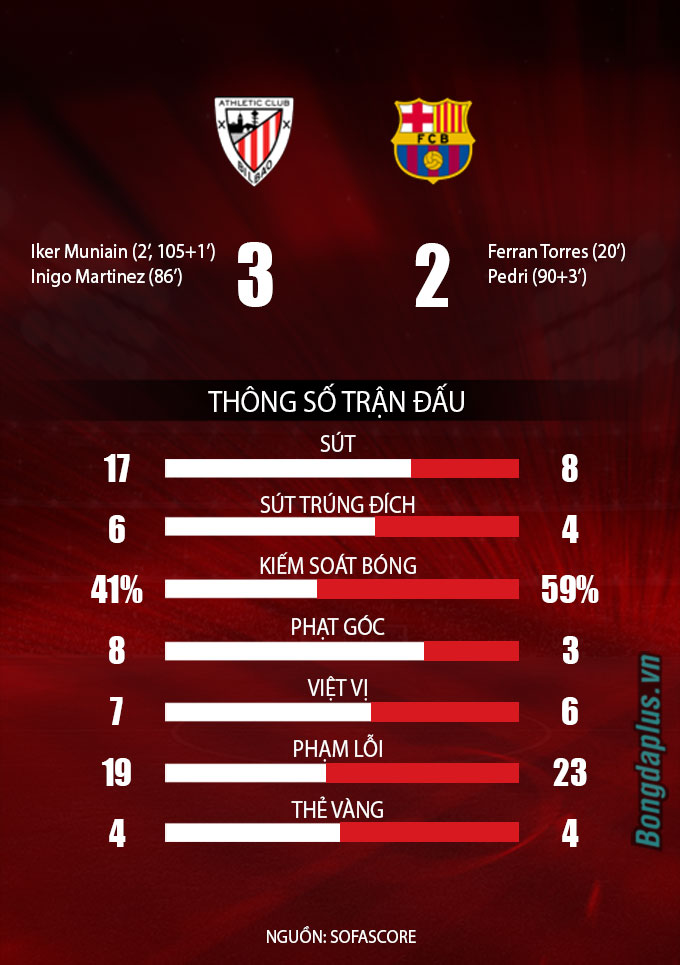 Trận đấu buộc phải kéo vào hiệp phụ. Phút 105+1, trọng tài cho Bilbao hưởng phạt đền sau khi xác định Alba để bóng chạm tay trong vòng cấm. Trên chấm 11m, Iker Muniain hoàn tất cú đúp giúp Bilbao một lần nữa vươn lên dẫn điểm.