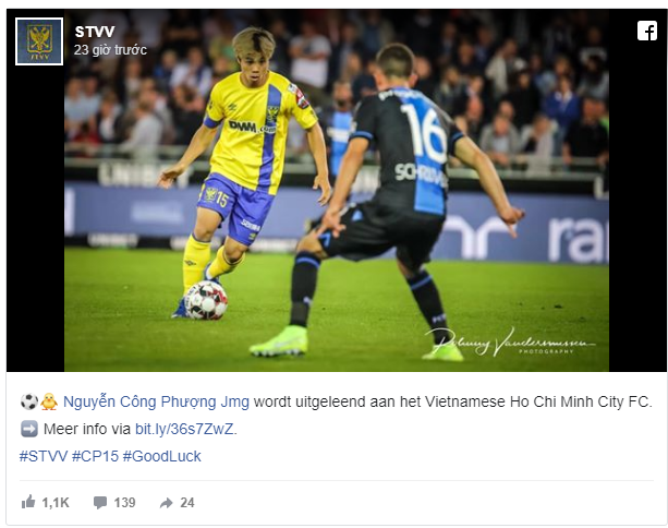 "Cầu thủ Việt Nam - Nguyễn Công Phượng sẽ chuyển tới CLB TP.HCM theo dạng cho mượn đến hết mùa giải. Công Phượng đến Sint-Truidense mùa Hè vừa qua, ra mắt trong trận đấu với Club Brugge. Sint-Truidense chúc anh thành công, may mắn tại CLB mới của mình”.