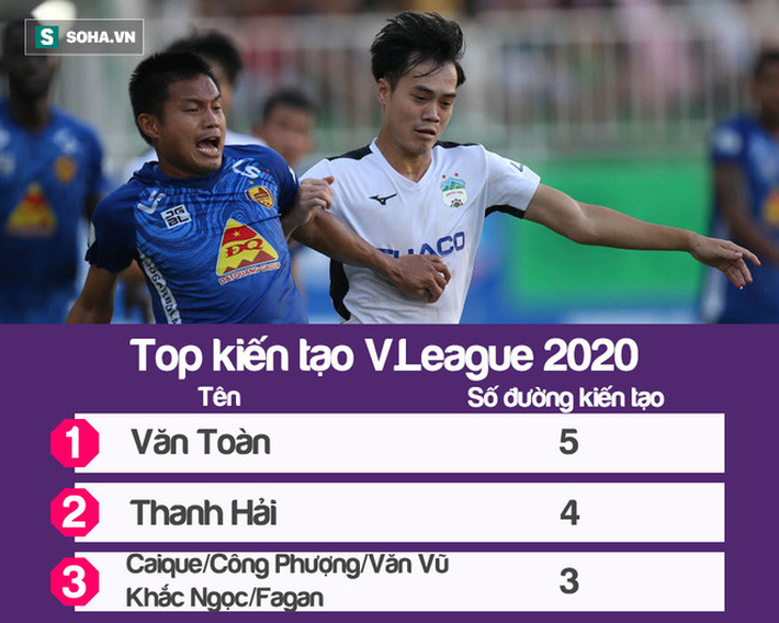 Trở lại với các thống kê, Văn Toàn hiện cũng đang dẫn đầu trong danh sách kiến tạo tại V.League 2020. Đứng phía sau anh là Thanh Hải (4 kiến tạo) và 5 cầu thủ khác cùng có 3 đường kiến tạo. Mùa giải trước, Văn Toàn cũng là "vua kiến tạo" V.League với 11 lần dọn cỗ cho đồng đội.