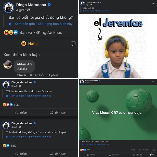Theo đó, tài khoản Facebook của Maradona thay ảnh đại diện bằng ảnh cố huyền thoại Pele, đồng thời đăng tải trạng thái khẳng định danh thủ Argentina vẫn đang còn sống và đám tang năm 2020 chỉ là giả.