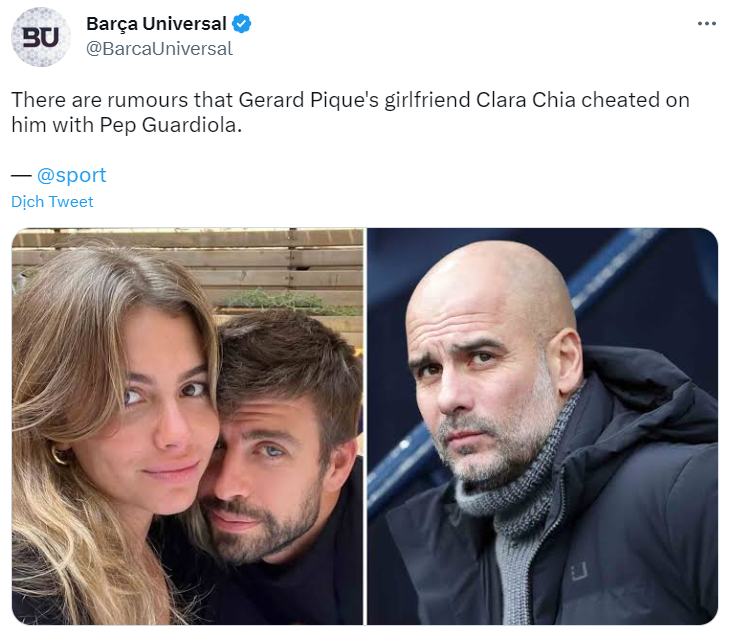 Theo tờ Sport, bạn gái mới của Pique là Clara Chia đã cặp kè với một người đàn ông khác trong nhiều tháng qua. Càng sốc hơn khi tờ báo Tây Ban Nha này tiết lộ "tiểu tam" đó là Pep Guardiola - HLV từng dẫn dắt Pique trong màu áo Barca khi xưa.