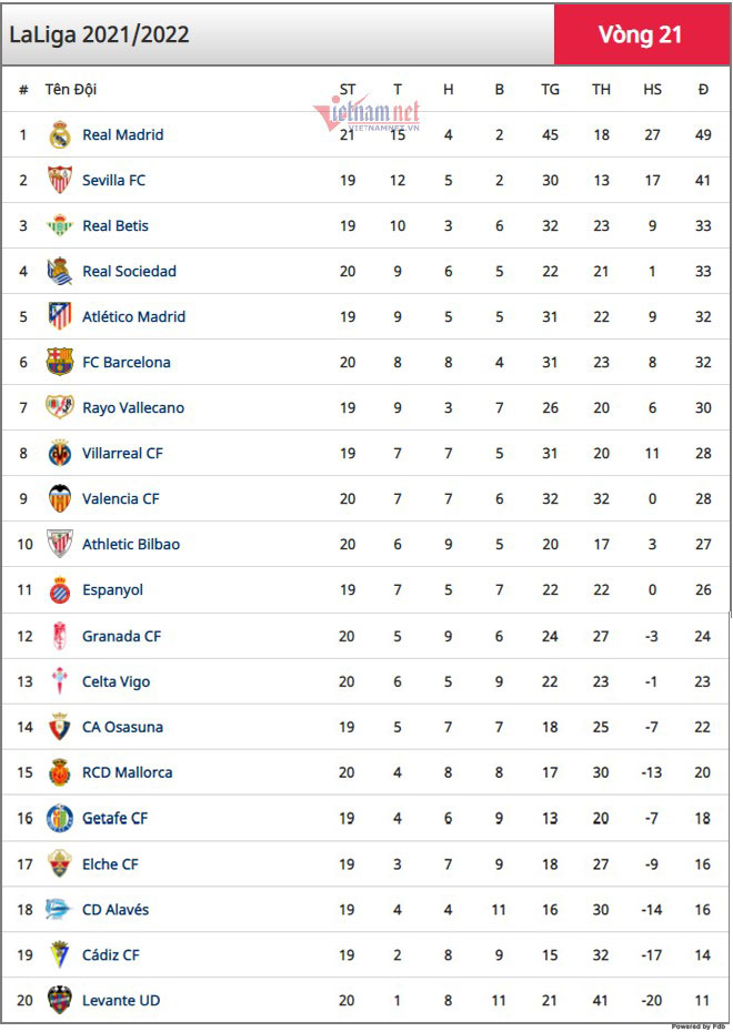 Bộ đôi Benzema - Vinicius cùng nhau tỏa sáng giúp Real Madrid đánh bại Valencia với tỷ số 4-1, qua đó củng cố ngôi đầu La Liga với 8 điểm tạm nhiều hơn Sevilla.