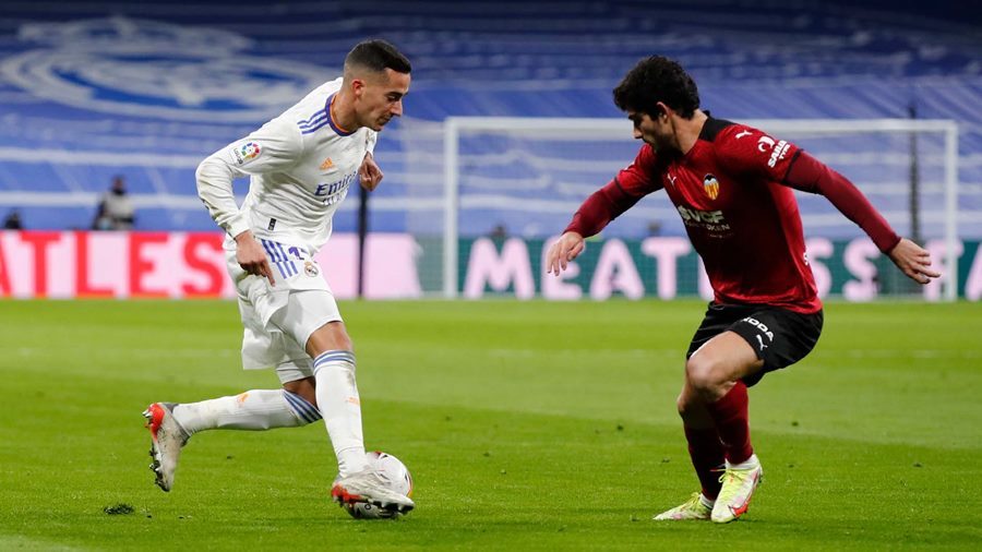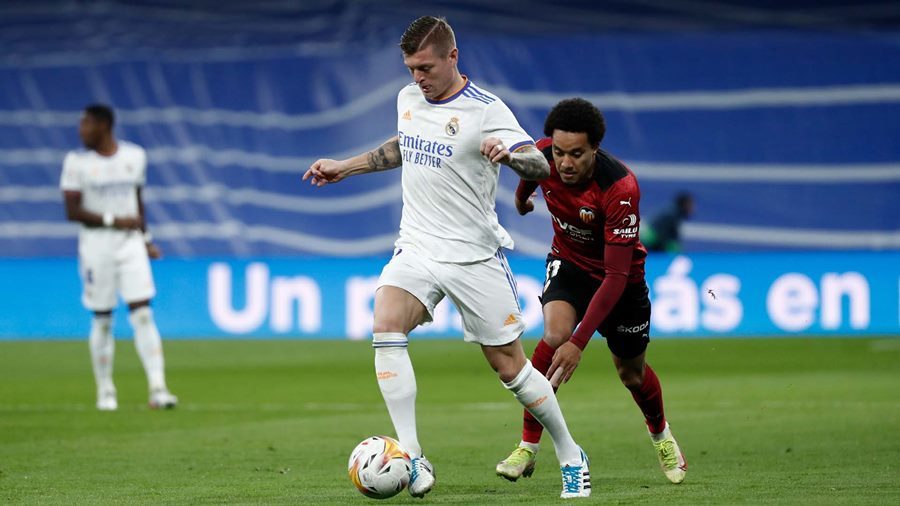 Real: Benzema (43'-pen, 88'), Vinicius (52', 61')Valencia: Guedes (76')