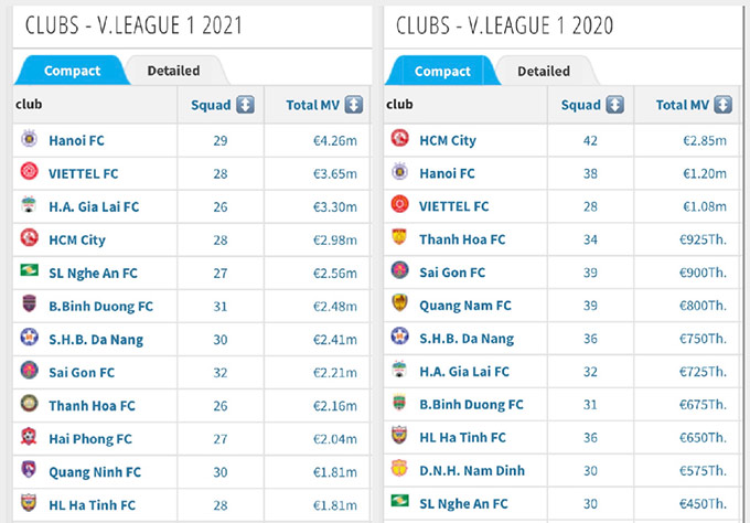 Hà Nội FC với hàng loạt tuyển thủ quốc gia cũng đã vượt qua TP.HCM để chiếm lấy vị trí đắt giá nhất V.League. Giá trị của đội bóng cũng tăng gần 4 lần, từ mức 1,2 triệu euro lên đến 4,2 triệu euro. Đương kim vô địch Viettel cũng tăng gấp 3 lần khi từ mức 1,8 triệu euro năm ngoái lên 3,65 triệu euro ở mùa giải năm nay. Đa số các CLB tại V.League đều tăng giá trị so với V.League 2020. Nếu như ở mùa 2020, chỉ có 3 CLB của Việt Nam có tổng giá trị được định giá bởi Transfermarkt là trên 1 triệu euro thì ở mùa này, đội V.League có giá trị thấp nhất cũng đã ở mức 1,81 triệu euro.