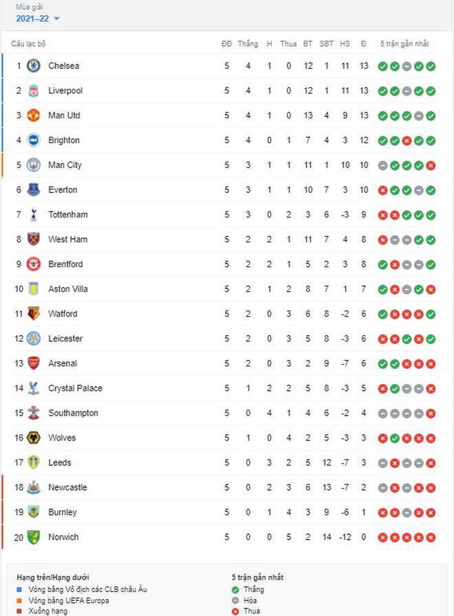 Đáng chú ý, The Blues gây ngạc nhiên khi bằng điểm, bằng các chỉ số phụ với Liverpool (13 điểm, thắng 4, hòa 1, ghi 12 bàn và thủng lưới 1) nhưng được xếp trên theo... thứ tự bảng chữ cái.