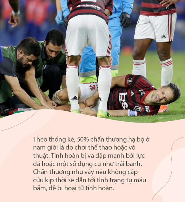 Theo thống kê, 50% chấn thương hạ bộ ở nam giới là do chơi thể thao hoặc võ thuật. Tinh hoàn bị va đập mạnh thường là bởi lực đá hoặc một số dụng cụ như trái banh. Chấn thương như vậy nếu không cấp cứu kịp thời sẽ dẫn tới tình trạng tụ máu bầm, càng để lâu càng dễ bị hoại tử tinh hoàn.