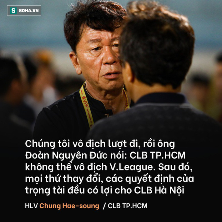 2. Ông Chung Hae-soung nhắm thẳng vào trọng tài trong phát biểu với báo giới Hàn Quốc. Song điểm lại con đường 11 vòng đấu mà ông tố là "có vấn đề", không khó để nhận ra chỉ có một quyết định của trọng tài là gây tranh cãi liên quan đến cuộc chiến "tay đôi" giữa CLB TP.HCM và Hà Nội.