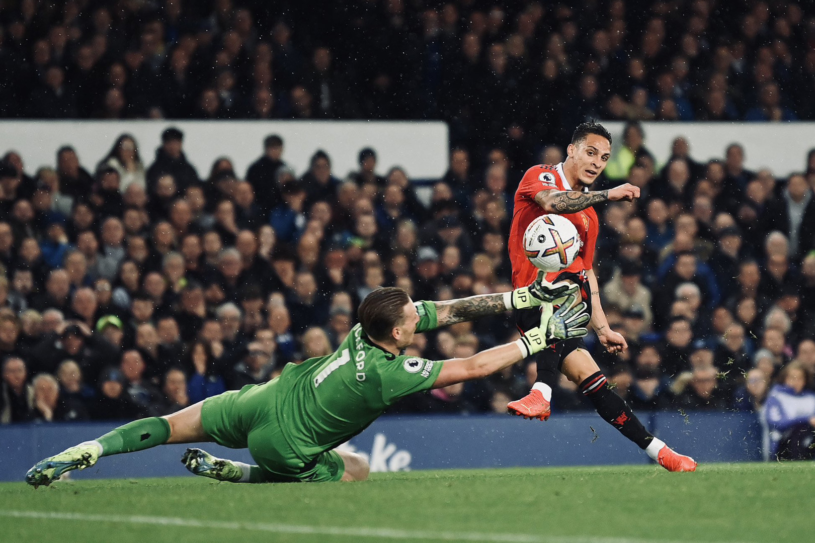 Phút 15, Anthony Martial chọc khe cho Antony áp sát khung thành. Jordan Pickford băng ra để bắt bài, nhưng vẫn không thể cản cú đặt lòng chân trái sở trường của tiền đạo trẻ bên phía MU.