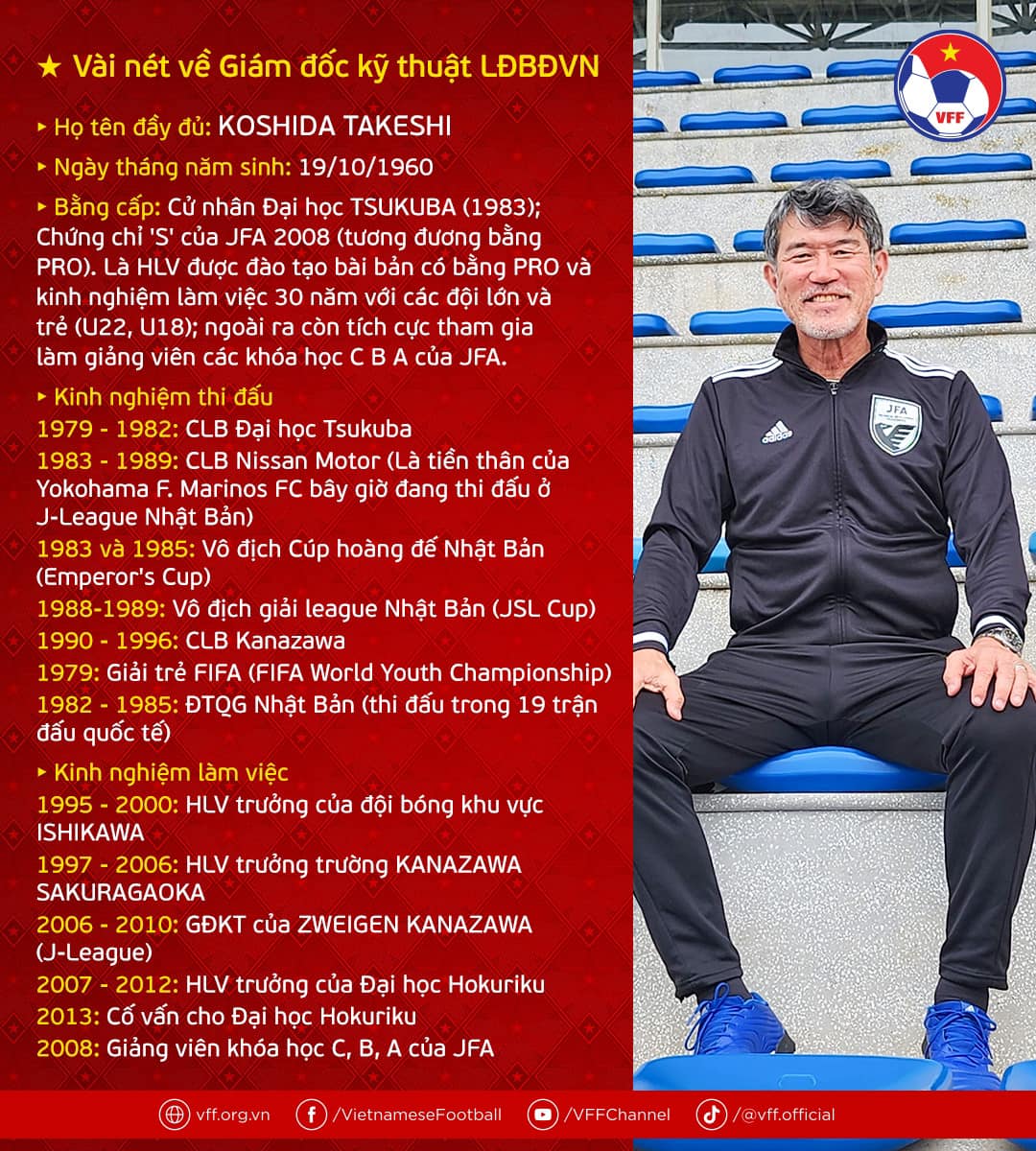 Tân Giám đốc kỹ thuật Koshida Takeshi chia sẻ: “Tôi cảm thấy may mắn khi đảm nhiệm vị trí này. Việt Nam là quốc gia năng động, có nền bóng đá phát triển, đặc biệt là bóng đá trẻ. Trên cương vị Giám đốc kỹ thuật, tôi hy vọng mình sẽ đóng góp một phần sức lực nhỏ bé, đào tạo thế hệ trẻ kế cận, góp phần giúp bóng đá Việt Nam tham dự World Cup 2026 hoặc 2030″.