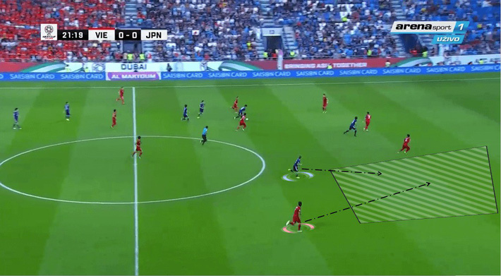 Khi anh chồng biên và chiếm lĩnh không gian ở cánh, động thái này sẽ tạo ra một phương án cho các đồng đội ở phía trên anh có thể di chuyển cắt vào trong và hỗ trợ cho tiền đạo trung tâm. Trong đội hình 3-4-3 của Việt Nam, đó chính là những gì đã diễn ra trong hầu hết các đợt tấn công của họ.