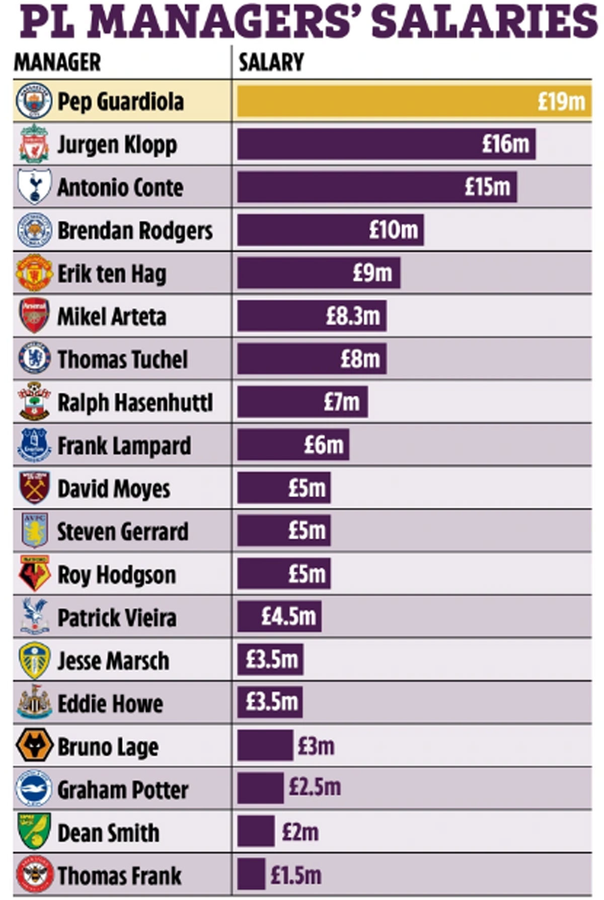 Người dẫn đầu là Pep Guardiola với mức 19 triệu bảng mỗi năm. Tuy nhiên, ông xứng đáng nhận được mức đãi ngộ này khi giúp đội bóng giành được rất nhiều vinh quang trong những năm gần đây. Jurgen Klopp là người kiếm được nhiều tiền thứ 2 với 16 triệu bảng mỗi năm.