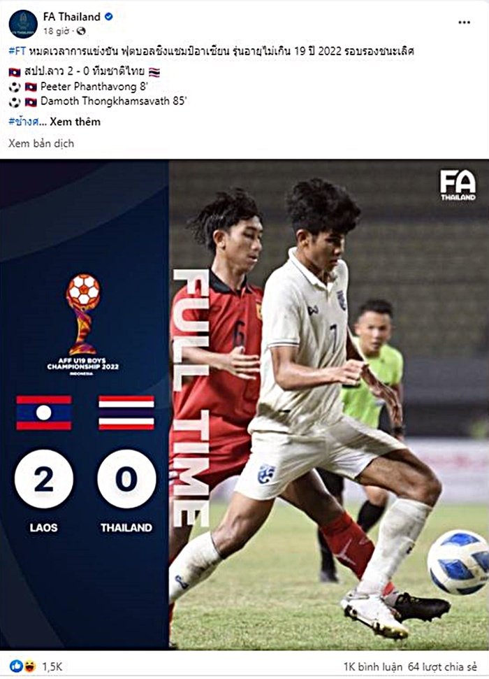 Trang FootballSiam đăng tải vào tối hôm qua (13/7): "Thua Lào thật sao? Không ngờ sau 19 năm thì chúng ta đã thực sự thua Lào. Nhận hai bàn thua, các cầu thủ trẻ Thái Lan vẫn chơi như không có gì sợ.