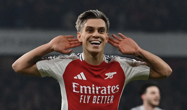 Leandro Trossard vui mừng với bàn thắng nâng tỉ số lên 2-1 cho Arsenal