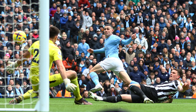 Tới phút 15, bàn thắng đã đến. Foden đi bóng xộc thẳng vào khu cấm địa của Newcastle trước khi tung ra cú dứt điểm chạm chân hậu vệ đội khách đổi hướng và bay thẳng vào lưới.
