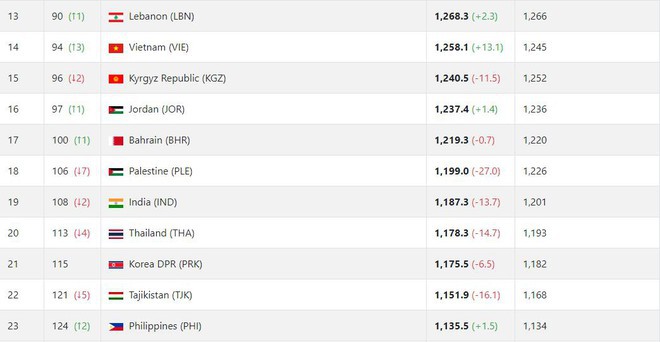 Dù vậy, trận thắng UAE hôm 14/11 giúp thầy trò HLV Park Hang-seo có thêm 15,05 điểm. Như vậy sau 2 trận đấu trong tháng 11, tuyển Việt Nam tích lũy thêm 13,1 điểm, nâng tổng điểm lên thành 1.258 và đứng hạng 94 thế giới.