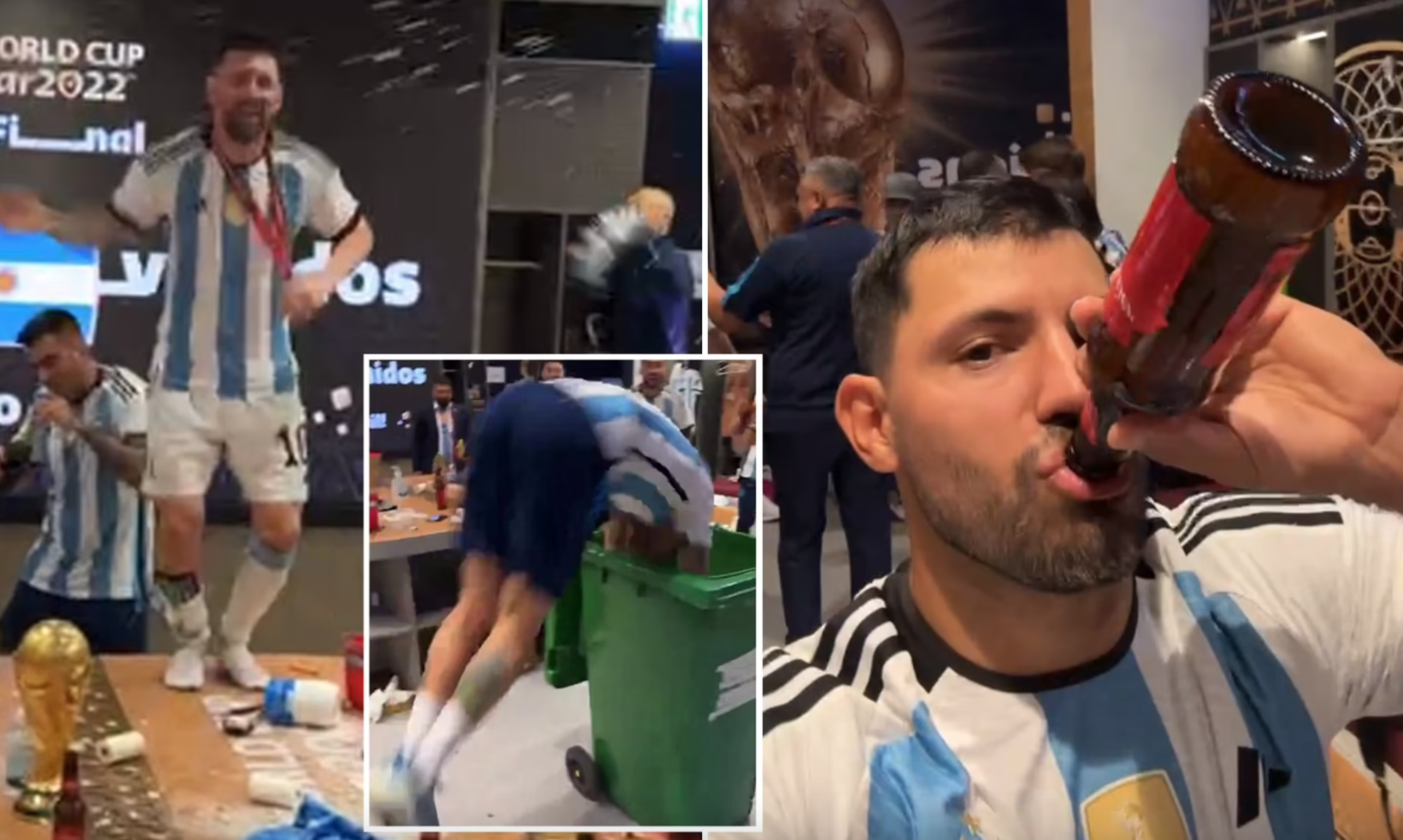 Theo đó, các cầu thủ Argentina nhảy lên bàn hò hét. HLV Lionel Scaloni bị các học trò tưới champagne, thậm chí ném khăn lau vào đầu. Leandro Paredes còn thực hiện màn nhào lộn cắm đầu vào thùng rác.