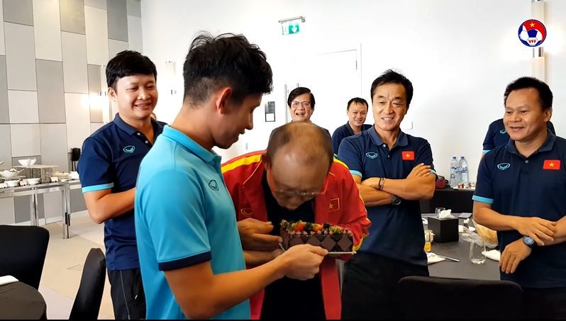 Sau khi ban huấn luyện và các đồng đội hát chúc mừng sinh nhật Hồng Duy, HLV Park Hang Seo chỉ bảo cậu học trò phải dùng miệng để ăn trái nhỏ trên chiếc chiếc bánh gato.
