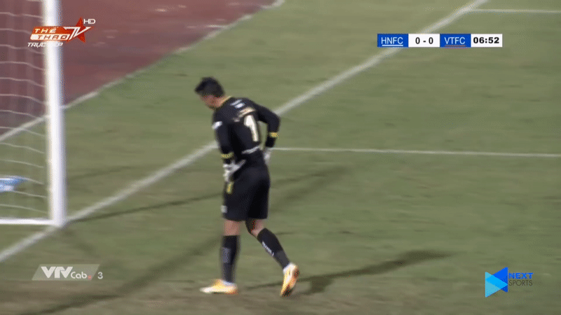 Cú sút ngoài vòng cấm địa của Trọng Hoàng vừa rồi khỏi chân, Tấn Trường đã khuỵu chân xuống "bắt bài". Kết quả, cú sút ấy không hề khó, chỉ có điều nó lại nằm ngoài tầm với của Tấn Trường đang quỳ trên hai gối, thay vì đứng bắt bóng như những thủ thành khác.